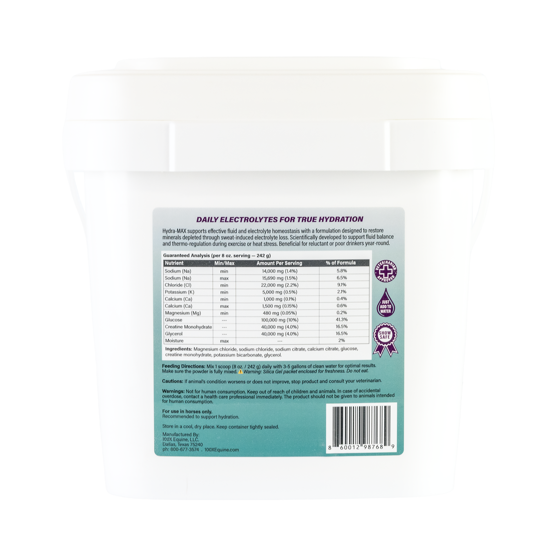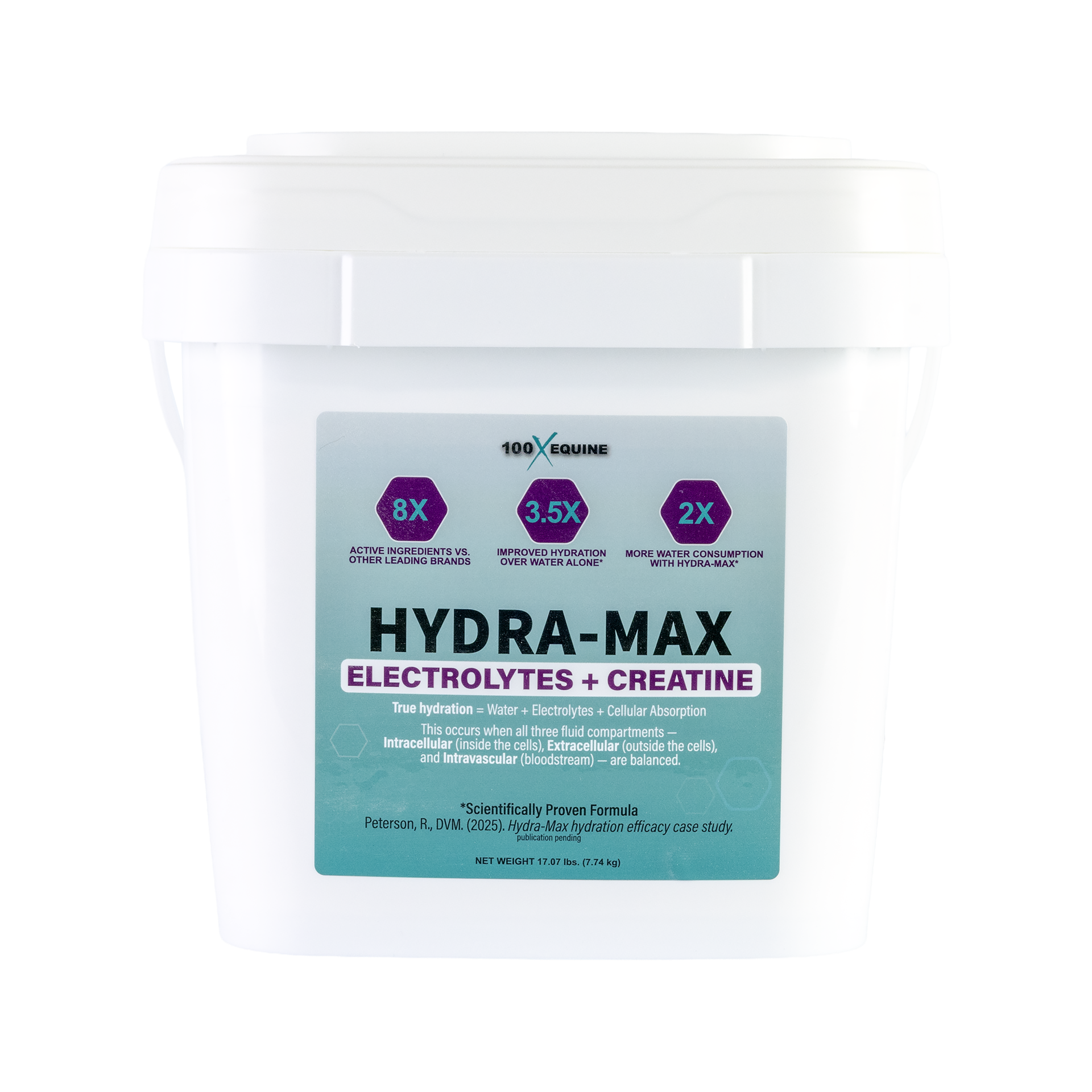 Hydra-MAX is a science-backed electrolyte and creatine formula developed by PhD scientists and Equine Veterinarians who understand the real demands placed on performance horses. Unlike standard electrolyte products that focus only on surface-level replenishment, Hydra-MAX is formulated to support hydration at a deeper, cellular level—helping horses drink better, recover faster, and maintain more consistent energy.